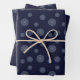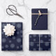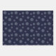 Ein spitz-artiges kreisförmiges Mandala in hellblau mit leuchtend blauen und goldfarbenen sternähnlichen Punkten, die zwischen den Schichten verstreut sind, sorgt für einen Spaß, ein Design, das an einen sternenförmigen Nachthimmel erinnert. Zwei Blätter in diesem Set sind mit der Mandala verstreut über einen tiefen blauen Hintergrund, während das dritte Blatt ein Muster verblasster Polka Punkte auf dem gleichen blauen Hintergrund zeigt, um Ihnen Optionen und Abwechslung für Ihre Geschenkverpackung oder DIY-Projekte.