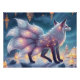 Eine mystische, detaillierte Fantasy-Szene mit einem astralen Fuchs mit neun fließenden Schwänzen, jeder ein Band schimmernden Lichts in Lavendeltönen, aquamarin und weich Gold. Das Fell des Fuchses leuchtet mit sanfter Strahlung, subtil gemustert mit Konstellationen, die über den Körper blinken. Es bewegt sich leise und anmutig durch eine surreale Traumlandschaft, die aus schwimmenden Inseln, glühenden Kristallen und ätherischen Nebeln besteht. Die Umgebung strahlt ein Gefühl von Magie und Ruhe aus, mit sanftem, hellen Licht, das die elegante Form des Fuchses und die mystische Umgebung hervorhebt. Die Szene fängt eine Aura des Staunens, der himmlischen Schönheit und der antiken Mystik ein, die komplexe Details mit einer traumhaften Atmosphäre vermischt.