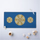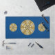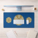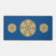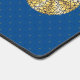 Un mandala en forme de dentelle concentrique en bleu foncé avec des points bleu vif et dorés comme des étoiles qui s'étalent entre les couches et un cercle en dégradé de soleil brillant derrière fait un design amusant qui rappelle un ciel étoilé et une journée ensoleillée brillante avec une image.