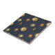 An elegant celestial pattern ceramic tile featuring golden suns, crescent moons, and scattered stars set against a deep midnight blue background. Inspired by vintage astrology and mystical night skies, this seamless design blends luxury gold textures with cosmic symbolism.