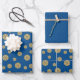 Ein spitzenähnlicher, zentristischer Zirkel Mandala in dunkelblau mit leuchtend blauen und goldfarbenen sternähnlichen Punkten, die zwischen den Schichten verstreut sind, und ein heller Sonnenaufgang-Gradientenkreis dahinter sorgen für ein lustiges Design, das an einen Sternenhimmel erinnert und an einen hellen Sonnentag mit einem Bild. Zwei Blätter in diesem Set zeigen die Mandala verstreut über einen reichen blauen Hintergrund, während das dritte Blatt ein Muster verblasster Polka Punkte auf dem gleichen blauen Hintergrund zeigt, um Ihnen Optionen und Abwechslung für Ihre Geschenkverpackung oder DIY-Projekte.