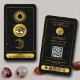 Eine wunderschöne schwarz-goldene himmlische Tarot- und Mondkarte. Eine einfache und berufliche Art, Ihr Unternehmen vorzustellen. Passen Sie das Firmenlogo und den QR Code an und erstellen Sie Ihre eigene Visitenkarte. In dieser Visitenkarte enthaltene Symbole der sozialen Medien. Ideal für Friseure, Augenbrauenspezialisten, Schönheitssalons, Schminkkünstler, Ästhetiker und vieles mehr. Die Visitenkarte ist ideal für Augenbrauenspezialisten, Augenbrauenspezialisten, Schönheitssalons.