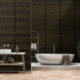 Dieses Selbstklebpapier für Wände und Handwerk hat ein himmlisches Thema mit Reihen texturierter goldener Sterne auf einem schwarzen Hintergrund.