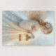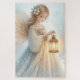 A serene winter angel stands in a gentle snowfall, holding a softly glowing lantern that casts warm light across a peaceful forest scene. Her delicate wings, embroidered gown, and hand placed tenderly over her heart evoke a feeling of comfort, hope, and quiet blessing. Soft blues, warm golds, and subtle winter florals blend together to create a dreamlike seasonal moment filled with emotion and grace. The angel’s contemplative pose and the lantern’s radiance offer a sense of guidance, stillness, and spiritual warmth, making this design ideal for winter décor, thoughtful holiday imagery, and meaningful keepsakes. AI generated artwork.