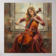 Eine junge blonde Frau in einem fließenden roten Kleid spielt elegant ein Cello an einem sonnendurchfluteten Fenster, festgehalten in weichen, impressionistischen Pinselstrichen, die zeitlose Eleganz und musikalische Leidenschaft hervorrufen.