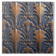 Art Deco Blumenmuster mit einer kupferfarbenen Celosia argenta Blume auf blauem Hintergrund, symmetrisches Design, Vintager Stil, elegant und dekorativ, komplexe Details, stilisierte botanische Elemente.