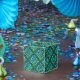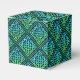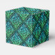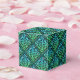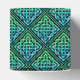 Ein Gefälligkeitskasten mit einem blau-grünen keltischen Knoten wiederholtes Kachelmuster auf schwarzem Hintergrund.