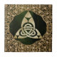 Keltische Dreifaltigkeit ist mit floralen Filigree auf dunklem Waldhintergrund gerahmt.
