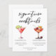 Cette feuille de menu de cocktails sophistiquée vous propose une simple typographie noire au-dessus de 2 de vos boissons préférées et de leurs ingrédients pour votre bar mariage côtier. Un dessin chic Cosmopolitan et Cherry French 75 ajoute une touche ludique à votre menu du bar. Complétez avec les noms du couple et la date de leur réception.
