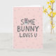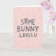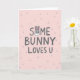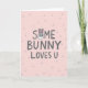 Ce design présente un fond rose pastel avec de grandes lettres sans empattement arrondies en blanc qui indiquent « SOME BUNNY LOVES U », donnant au message un ton doux et amical 🐰. Les mots sont centrés et occupent la majeure partie de l'espace, la phrase étant empilée de manière à donner une impression de proximité et de confort, comme un mot destiné à quelqu'un de spécial. Dans le mot « SOME », le « O » est remplacé par un simple visage de lapin, comme si le lapin regardait dans le message avec un regard doux et affectueux. Le lapin est dessiné avec un visage blanc rond, des yeux ronds en petits points noirs, un petit nez, des moustaches fines et de grandes oreilles avec des détails intérieurs rose pâle 🐇. Autour du lettrage, de petites étoiles pâles grises à cinq branches sont dispersées de manière lâche, ajoutant une touche légère et rêveuse sans détourner l'attention des mots. La palette limitée de rose blush, de gris doux et de blanc net garde tout calme et tendre, comme un moment de tranquillité
