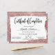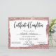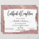 Modern elegant certificate of completion award features typography script ''certificate of completion'' in trendy handwritten lettering on a rose gold sparkly background and details of the course, company name etc in trendy capital lettering. Perfect for beauty, makeup, lashes courses etc.