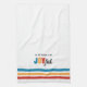 Jolie serviette de cuisine pour égayer votre cuisine tout au long de la saison des fêtes. "C'est la saison pour être joyeux. Serviette blanche à rayures turquoise, rouge et jaune.
