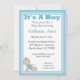 Bébé mignon en chemise bleue et couche rampant à travers votre invitation baby shower. C'est un garçon écrit sur le dessus. Customisez avec les détails de votre fête.