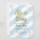 Cette conception de rayure bleue est parfaite pour inviter vos invités au baby shower ! Caractéristiques de parties scintillantes d'or. Copie arrière incluse.
