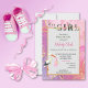 La carte Baby shower Invitation est entièrement personnalisable. De belles fleurs roses embellissent les lettres sur un arrière - plan en marbre rose glittery.