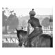 Dieses Pferd hauchte am Eröffnungstag in Saratoga mit einer Trainingsfrau. Fühlen Sie sich in diesem aufregenden Bild von Pferd und Reiter wie Power und Spannung. Das Foto ist in Schwarz und Weiß fertig, um eine Morgenstimmung mit Pferd und Reiter zu erzeugen. Fleetphoto