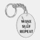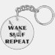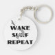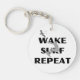 Ce porte - clé présente un design graphique dynamique d'une personne qui surfe sur la vague, avec une vague stylisée en dessous et un oiseau volant au-dessus. Les mots "RÉPÉTER LE SURF DE RÉVEIL" sont affichés en caractères gras au-dessus et au-dessous du surfeur. Ce design capte l'excitation et l'excitation du wake surf, ce qui en fait un accessoire parfait pour les amateurs de sports nautiques.