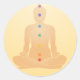 Original Illustration mit androgyner Person mit Regenbogenchakras in der Meditation Lotus Pose. Person ist illustriert mit Handflächen oben in der aufnahmefähigen Mudra. Die Chakras werden gezeigt: Anahata, Muladhara, Swadhisthana, Manipura, Vishuddha, Ajna, Sahasrara.