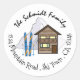 Ein runder, weißer Umschlag Aufkleber mit dem Doodle eines braunen Chalets , eines Berges und eines Paares oder eines blauen und orangefarbenen Skis . Personalisieren Sie es mit dem Namen und der Adresse Ihrer Familie . Diese Aufkleber für die Rücksendeadresse sind in verschiedenen Farben erhältlich. © ArianeC Illustrations-Alle Rechte vorbehalten