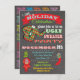 Invitations de Noël Super cool Ugly Sweater avec l'illustration d'un pull moche, d'une typographie amusante et de bannières sur un arrière - plan de tableau noir. Illustration tirée à la main par McBooboo.
