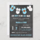 Phantastische und einzigartige Sport Thema Babydusche Einladungen für Jungen. Fußball, Fußball, Basketball und Baseball auf Kalkboard-Hintergrund und hängenden Baby-Jumpssuits. Blau und Weiß.Vorlagen zur Einladung. Bearbeitbarer Text Erhalten Sie passende Aufkleber!