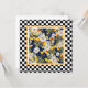 Das wunderschöne und künstlerische Bild mit seinen farbenfrohen, weißen Kamillenfarben und orangefarbenen Mohnblumen auf schwarzem Hintergrund mit schwarz-weißem Schachbrettrahmen
