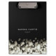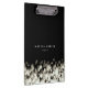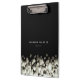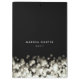 Die schicke schwarze Zwischenablage mit zwei Textzeilen in modernem weißem Schriftzeichen, die durch helle, in Weiß- und Champagnertönen gehaltene Bokelleuchten hervorgehoben werden. Design wiederholt sich auf der Rückseite.