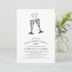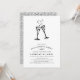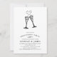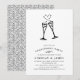 Elegante und festliche Einladungen in schicken Schwarz-Weiß-Tönen zeigen zwei Champagner-Flöten, die von einem Brausefeld begleitet werden, mit klassischen Schwarz-Party-Details. Die Karten kehren zu einem farbigen Muster von Reben und Knospen in Schwarz/Weiß zurück.