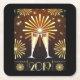 2019 Silvester Papier-Untersetzer mit Party-Atmosphäre. Goldene Champagnerflöten, die mit goldfarbenen Feuerwerken zusammenkleben, die überall explodieren. Jugendstil / Art Deko Stil Design.