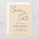 Einfache Hochzeit im Stile rette den aktuellen Einladungen, die mit einem schwarzen, stilisierten Script auf einem trendigen Champagner-Hintergrund ausgestattet sind. Bearbeiten und ersetzen Sie Namen, Datum und Position mit Ihrem eigenen. Wählen Sie Ihre Einladungsgröße und Ihren Papierstil aus.