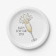 Neujahrspapier-Teller mit Blasen aus einem glänzenden Champagner-Glas für das Party dieses Neujahrs. Design in einem einfachen, coolen und modernen Stil.
