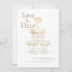 Foto Save the Date. Champagnerturm. Weißer Hintergrund. Modern. Hochzeitsseite. Gold-Text.