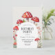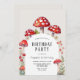 Invitation d'anniversaire avec un cadre voûté de champignons aquarelles. Customisez avec vos informations. Cliquez sur "cliquer pour customiser plus loin" pour modifier le style, la taille ou la couleur de la police.