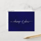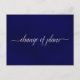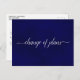 Cette belle carte postale est conçue pour tenir vos invités informés si vous devez annuler, modifier ou reporter vos plans de mariage. Elle présente un design simple mais élégant avec le texte "changement de plans" écrit en calligraphie sur un fond bleu marine marbré. Le dos est un espace de note personnalisé où vous pouvez expliquer tous les détails à vos invités. Bien que conçue pour les mariages, cette carte est suffisamment polyvalente pour être utilisée pour tout événement ou célébration.