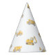 The perfect construction birthday party hat for your construction birthday. The construction birthday party hat design has a white background with a pattern of consturction trucks in yellow.