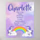 Purple Charlotte Name Poster with rainbow, unicorns and customizable text. The adjectives start with each letter of the chosen name. You can customize the adjectives for this name or choose another name and corresponding adjectives. Or you can contact me to customize a poster with your name of choice. NOTE: when customizing, the top name is written twice (once in purple and once with a lighter "shadow") to make it stand out.