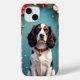 Der charmante Hund sitzt in einer spielerischen Pose, umgeben von einem dekorativen Blumenrahmen. Der Hund hat einen überwiegend weißen Mantel mit schwarzen Flecken und markanten braunen Markierungen auf seinem Gesicht. Er trägt einen roten Kragen mit einer Glocke, die sein zauberhaftes Aussehen noch verstärkt.