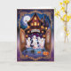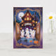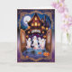 Genießen Sie diese hübsche Halloween-Illustration mit einer niedlichen schwarzen Katze, die aus einem Kürbishaus herausschaut und von einer festlichen Halloween-Szene umgeben ist.