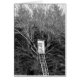 Image en noir et blanc de la cabane d'un chasseur de forêt avec escaliers en bois au sommet d'un arbre.