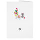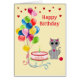 Chat d'anniversaire, coeurs et ballons multicolores sur la carte de voeux en ivoire. Tous les textes prêts à être personnalisés.