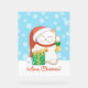 Chat blanc souriant dans un casquette de Noël rouge traditionnel tenant un grand cadeau emballé souhaite à chacun un très joyeux Noël! Dans sa patte gauche, le chat tient haut une cloche dorée avec un arc vert.