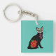Un chat noir avec le jour du crâne de sucre mort se maquille seul sur fond de turquoise.