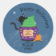Des autocollants bleus mignons avec un chat noir caché derrière un cupcake d'Halloween avec une glace verte. Personnalisez-le avec votre nom. Parfait pour sceller des sacs de faveur à une fête pour enfants. © ArianeC Illustrations-Tous droits réservés