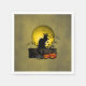 Eine Silhouette der schwarzen Katze von Théophile Steinlen für den Club Le Chat Noir in einem modernen Ambiente mit hellgelbem Mond, grauer Mauer mit Efeu und zwei Jack-o-Laternen.