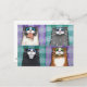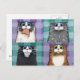 Carte postale de Whimsical cat art. Un montage de 4 peintures originales 2008 Lisa Marie Robinson. Mozart aime le Saumon, Facturé statiquement, Y a-t-il quelque chose dans mes dents?, Biggles aime l'herbe