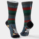 A pair of fun, cute, funny, festive, cosy-up, socks that have a fun winter cartoon donkey doodle illustration on the top and bottom, on a chic, blue grey gradient background, with a striped pattern with a warm colors, on the top.