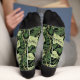 Un imprimé feuillage avec un feuille vert clair presque olive ou sage entrelacé dans des verts plus foncés. Une ombre de vert chasseur ou de vert foncé de forêt crée la grande majorité des feuilles. Sur un arrière - plan de noir.