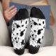 Dalmatian Spots Motif sock design pour les amateurs de poster de animal. La poster de animal est composée de petits et grands taches noires. Le design comprend également des plaques d'encre noire qui en font un motif de peau dalmate unique. Une jolie paire de chaussettes imprimées par un chien qui fera un grand cadeau à votre ami, collègue ou fille.