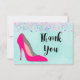 Un carte de remerciements avec une chaussure en stiletto rose chaud. Des confettis roses parsemés le long du sommet. Placez-vous sur un arrière - plan d'aquarelle vert menthe. Chic et glamour.