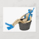 Billige Zuhause-Ferien, gezeigt von einem Modell, das in einer Metallwanne mit einem Scrollrad sitzt